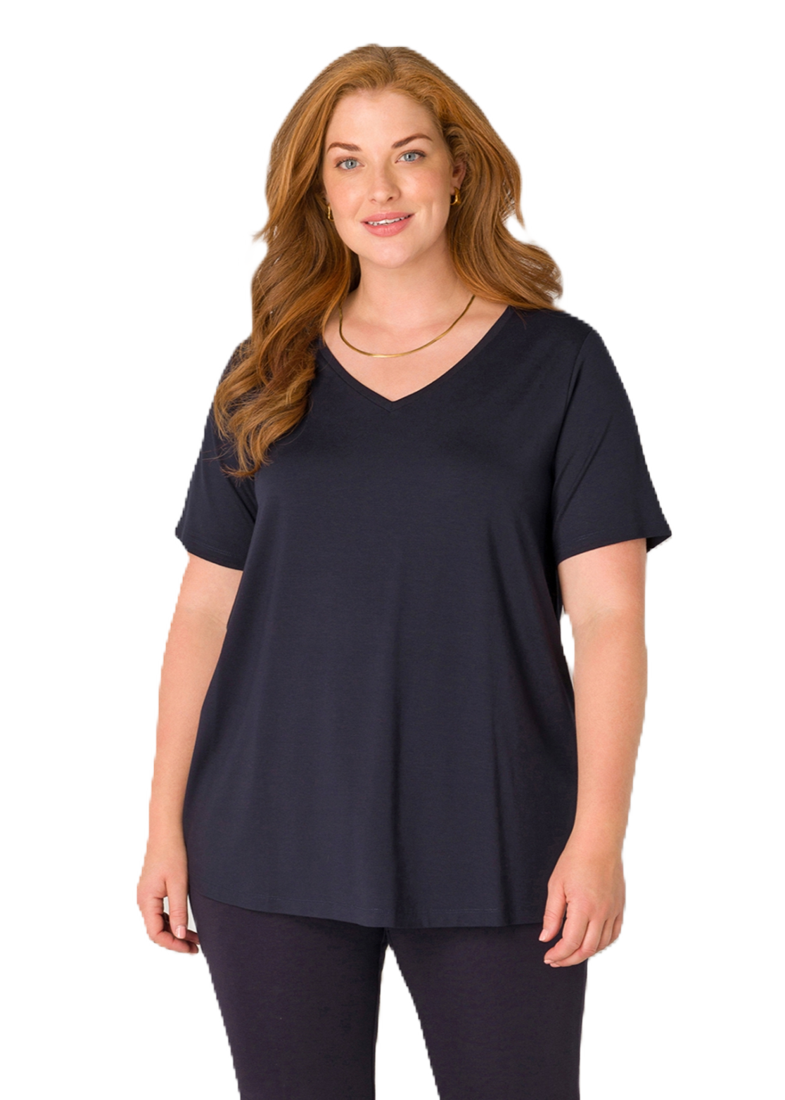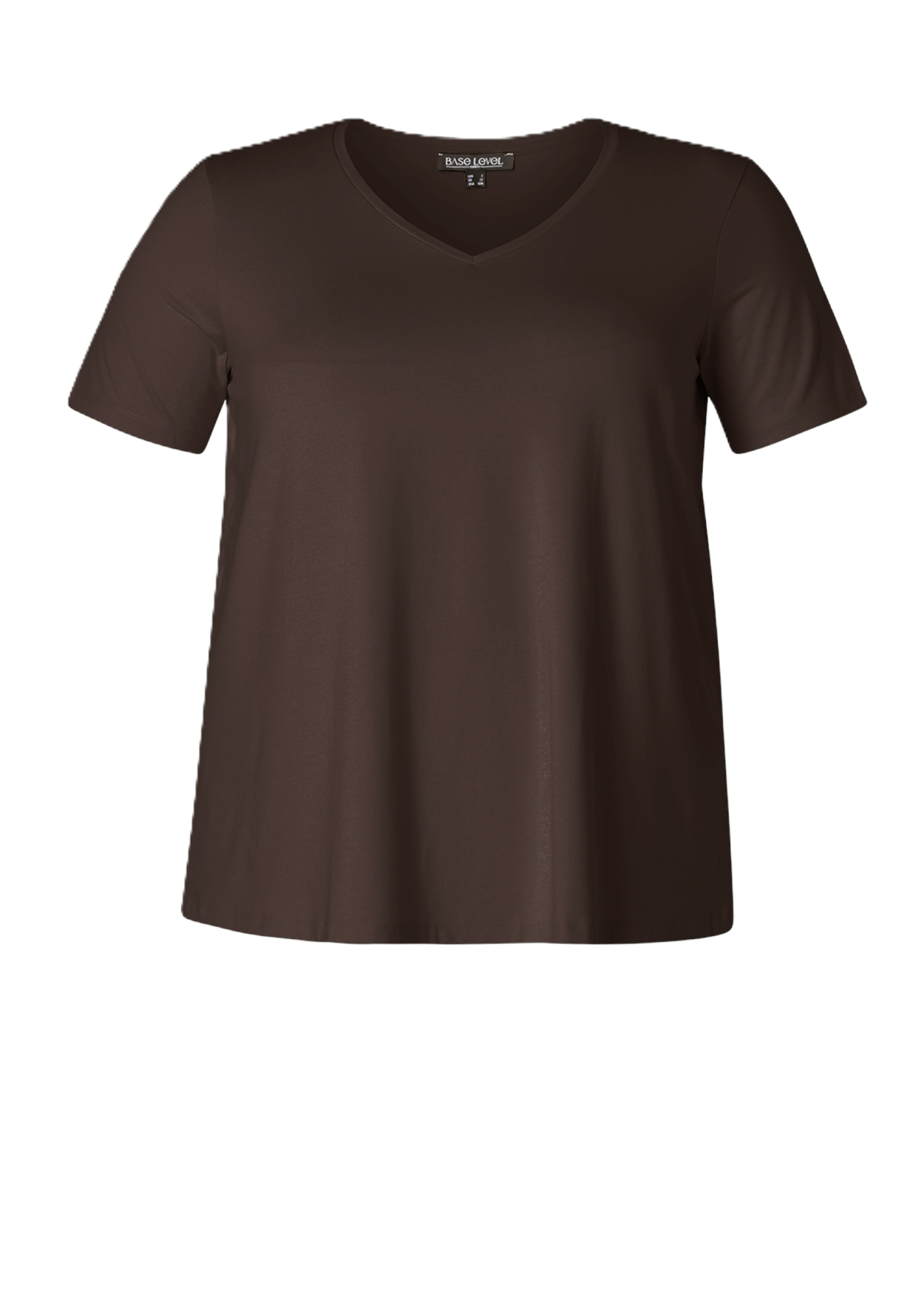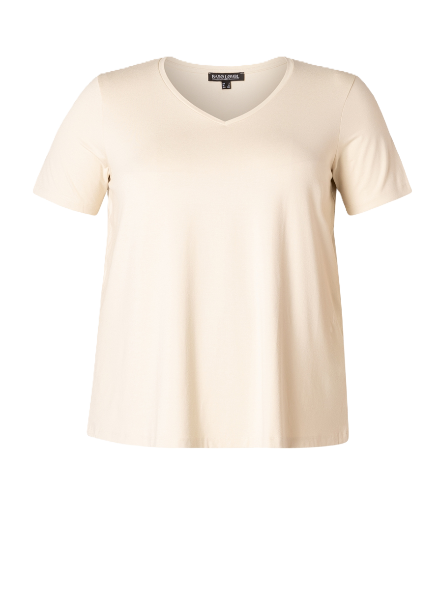 Alba is een recht T-shirt van een soepele viscosemix met een ronde halslijn en een omgeslagen zoom op de mouwen. 72 cm.