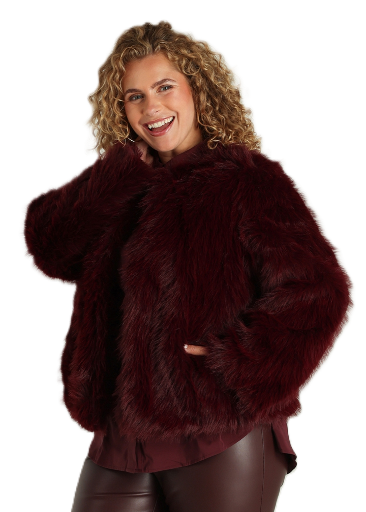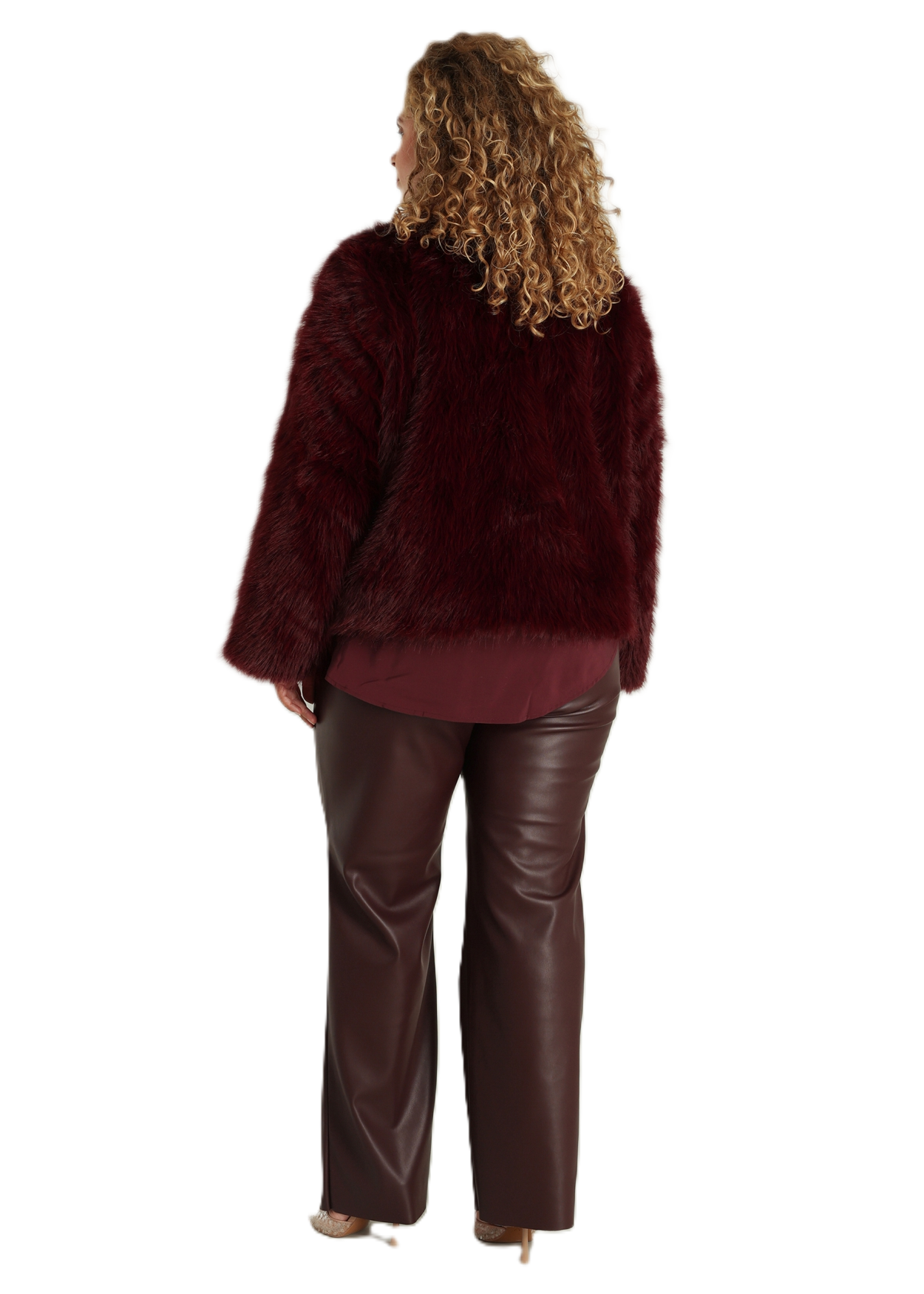 Een echte blikvanger: dit fake fur jasje heeft een volle, harige look in diepe port tint. Het korte model sluit met twee haakjes en heeft een ronde halslijn. Perfect om je outfit direct een luxe uitstraling te geven. Dit item blijft het mooist met professionele reiniging.