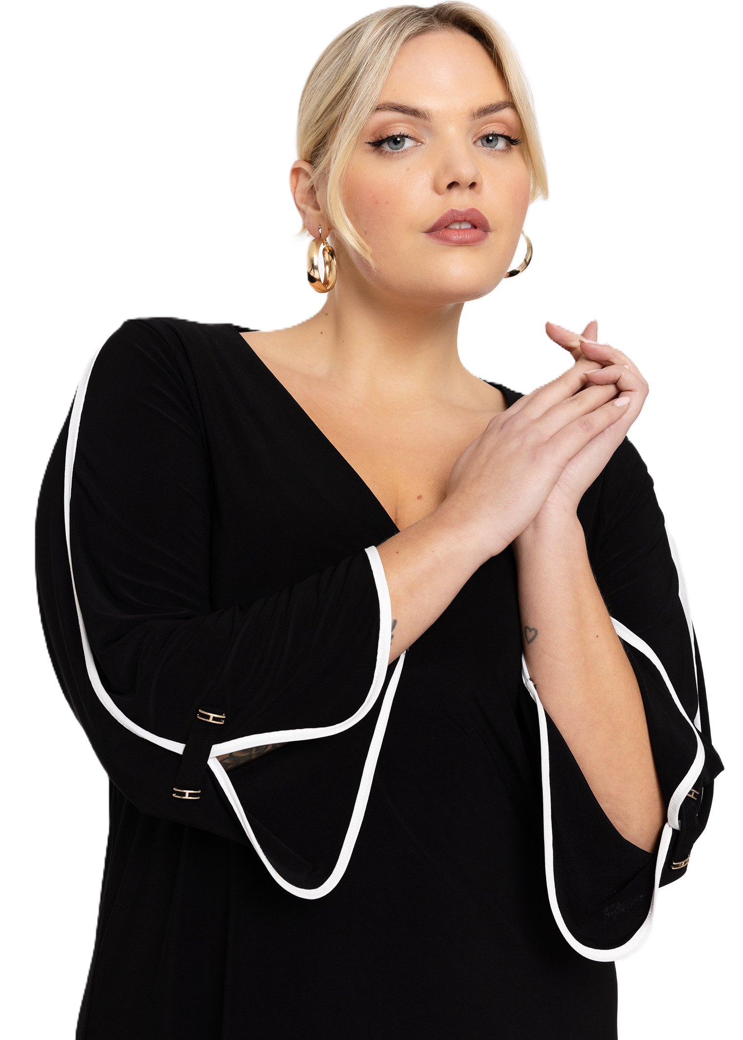 Deze A-lijn jurk uit de DOLCE collectie is een elegante basic met een twist. De jurk heeft een vrouwelijke V-hals en wijd uitlopende mouwen, die afgewerkt zijn met witte biezen en subtiele goudkleurige details. Dankzij de flatterende A-lijn pasvorm valt de jurk soepel over het lichaam en is hij geschikt voor elk figuur. Draag de jurk met hoge laarzen en een paar statement oorbellen voor een elegante look. Of combineer ?m met sneakers en een denim jasje voor een meer casual outfit.