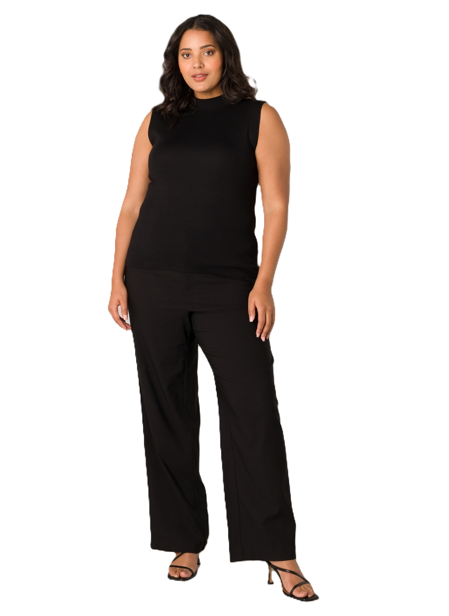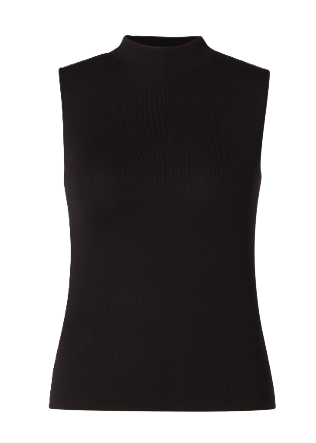Yaline is een getailleerde, mouwloze top met een turtlecol van een fijn gebreide viscose nylon mix. Lengte 68cm.