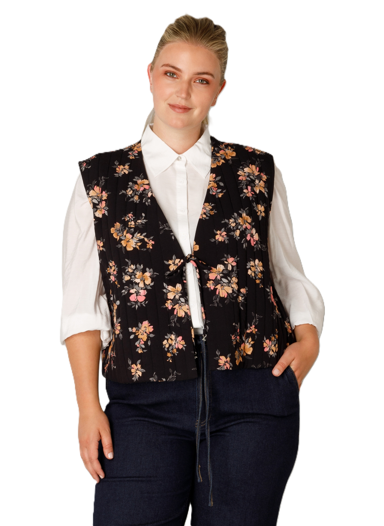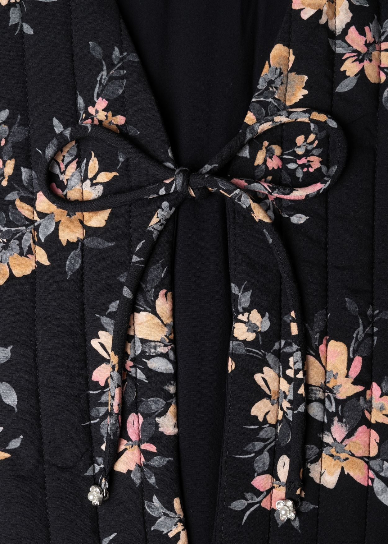Met dit giletje voeg je wat warmte en stijl toe zonder dat het te zwaar wordt. De zwart/roze bloemenprint geeft ?m een vrouwelijke touch, en de sluiting met twee strikjes maakt het helemaal af.