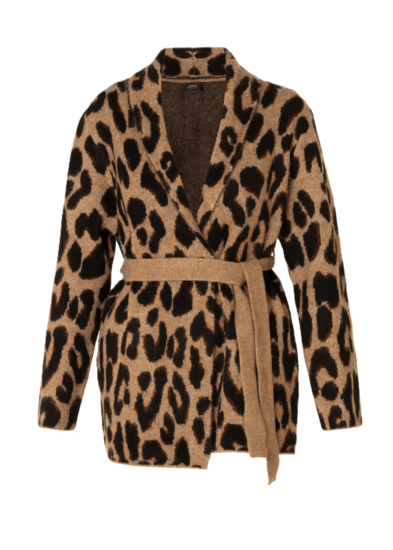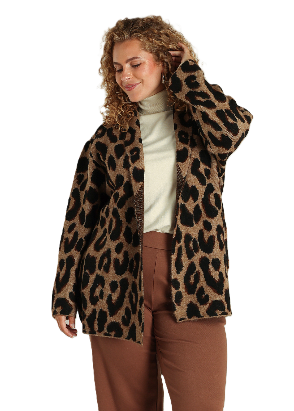 Zoek je een zacht en warm vest dat makkelijk combineert? Dit openvallende model met luipaardprint kun je casual dragen of met de ceintuur voor een meer gestructureerde look. De comfortabele stofmix en relaxed fit maken het een fijn item voor elk seizoen. Lengte 75 cm.