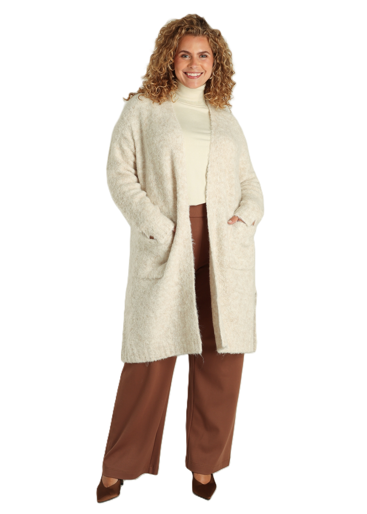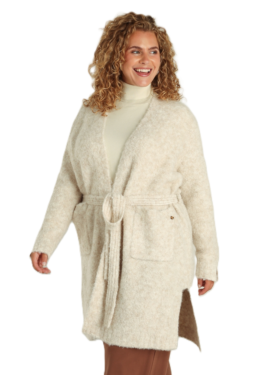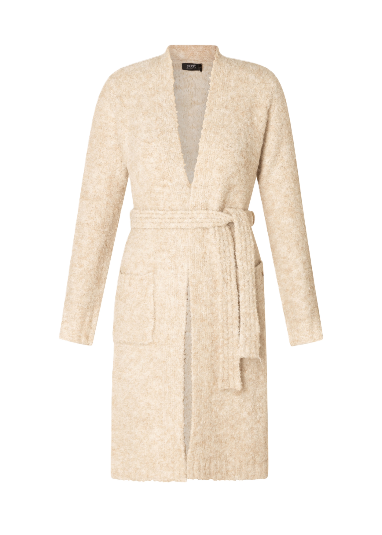 Een vest om in weg te kruipen! Dit knielange model van Yest is gebreid van een zachte mix met wol, nylon en gerecycled polyester. De fluffy afwerking voelt behaaglijk, terwijl de strikceintuur je taille accentueert. Met twee zakken aan de voorkant, ideaal voor een casual maar verzorgde look. lengte 97 cm.