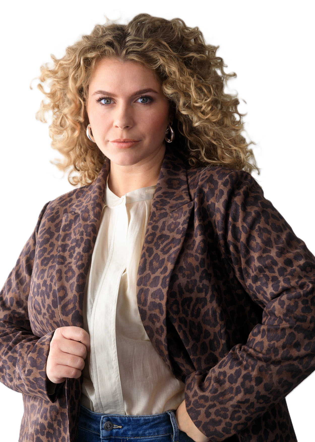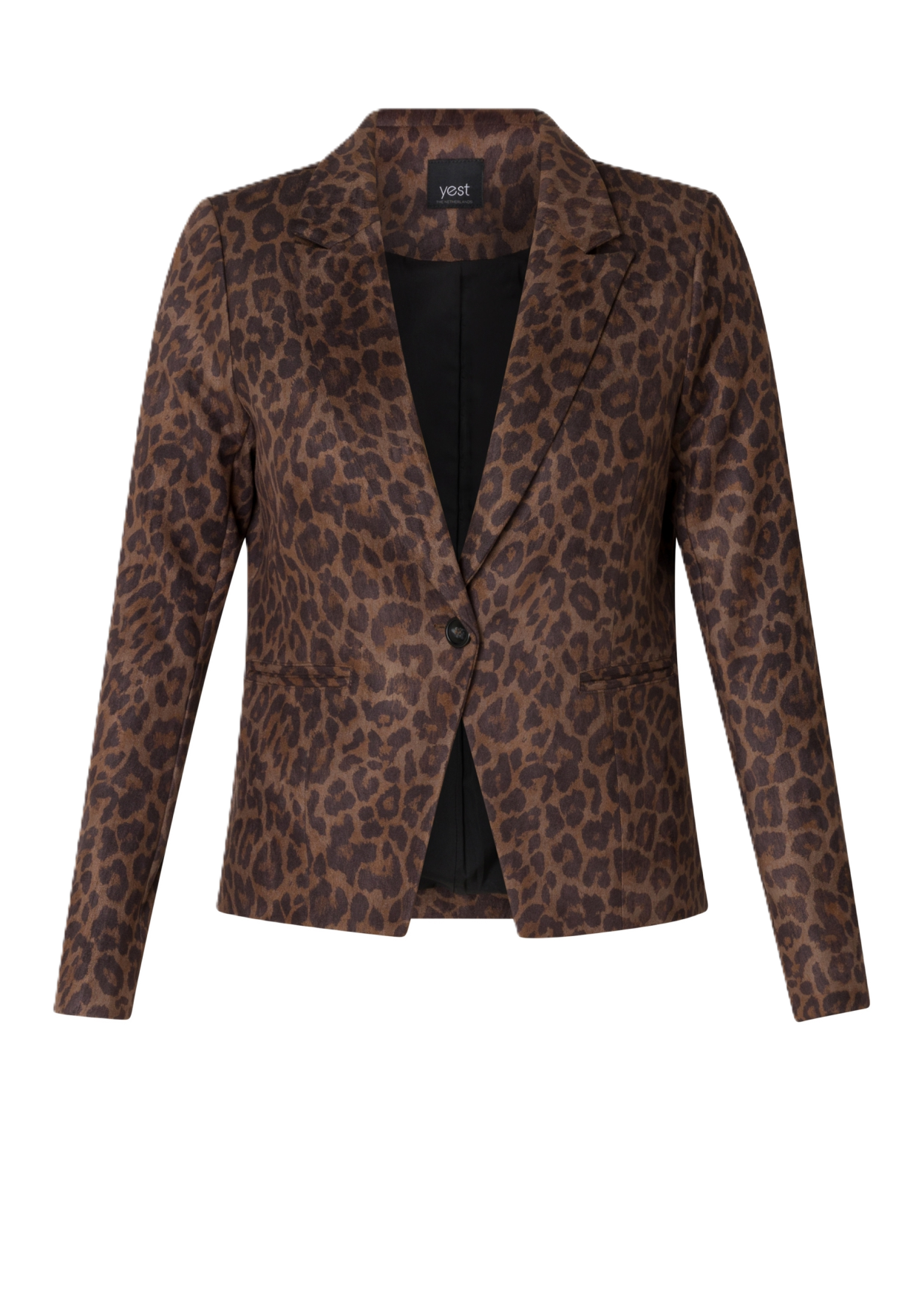 Deze blazer met animal print is een echte krachtpatser in je garderobe. Met een regular fit en scherpe revers combineer je moeiteloos comfort en een strakke look. De enkele knoop sluiting houdt het klassiek, maar de print zorgt voor een spannende twist. Combineer deze blazer met pantalon 5806 voor een total look! Lengte 70 cm.
