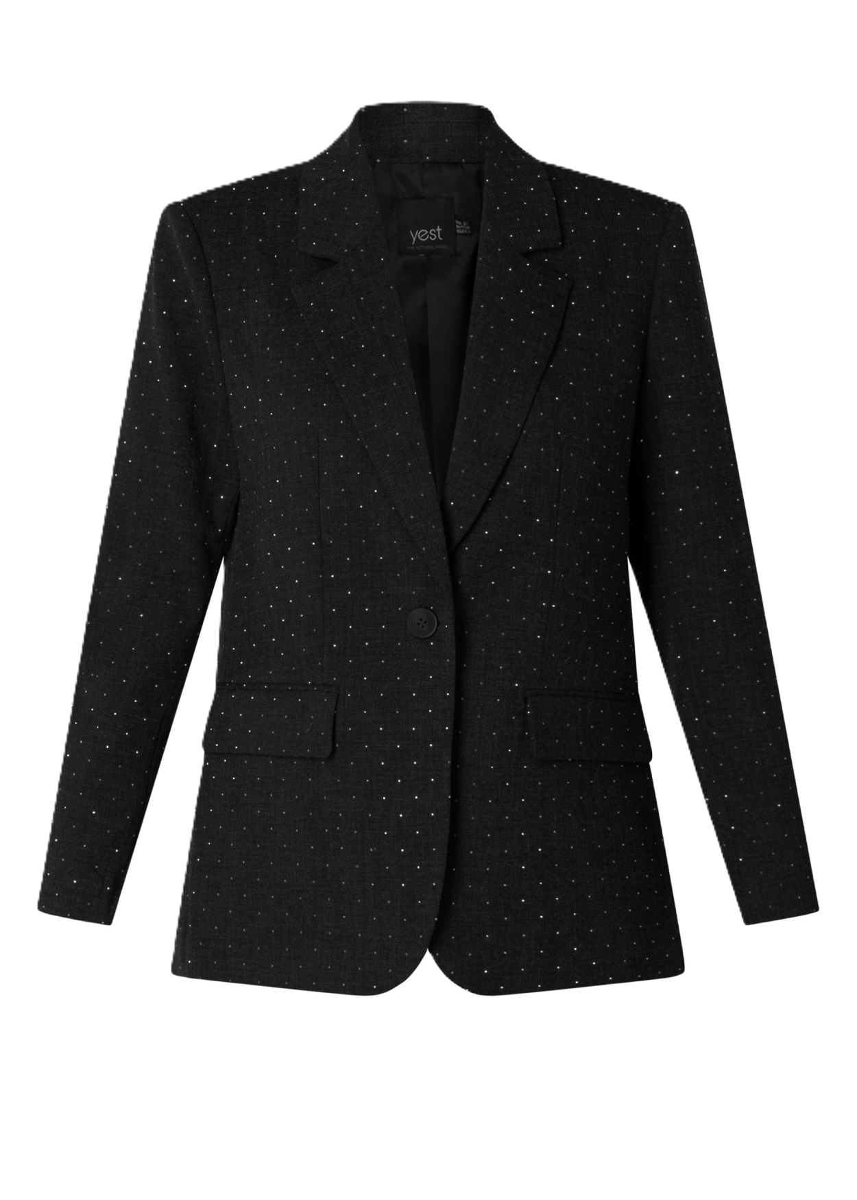 Deze Yest curve blazer heeft een regular fit en is versierd met allover glittersteentjes die een subtiel fonkelend effect geven. Het model is voorzien van een klassieke reverskraag, een knoopsluiting en klepzakken. Ideaal als opvallend item met een tijdloze pasvorm.