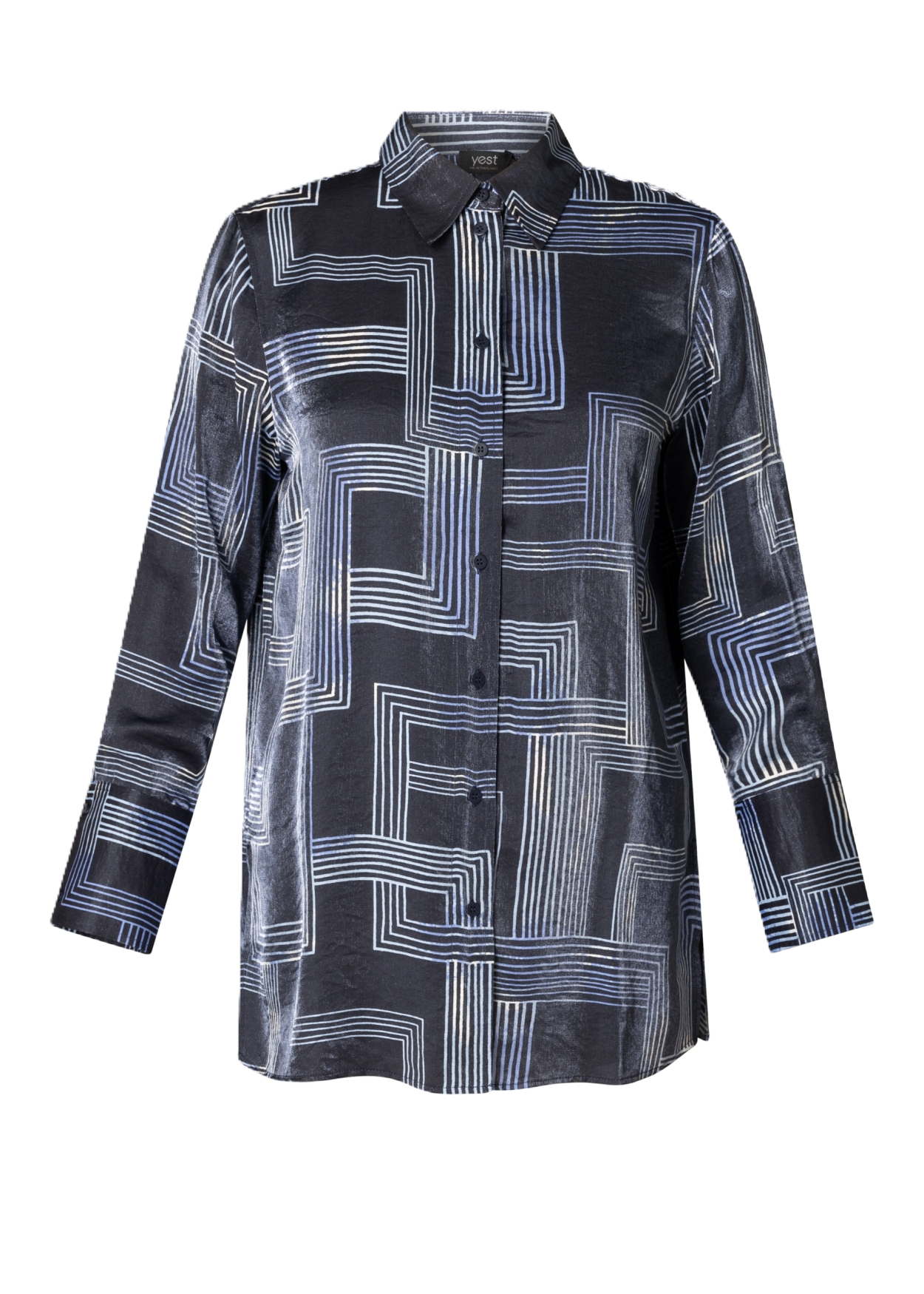 Deze blouse combineert een relaxte pasvorm met een eigentijds patroon. De viscose-nylon stof voelt licht en prettig aan, en de lange, wijde snit geeft een mooie flow.