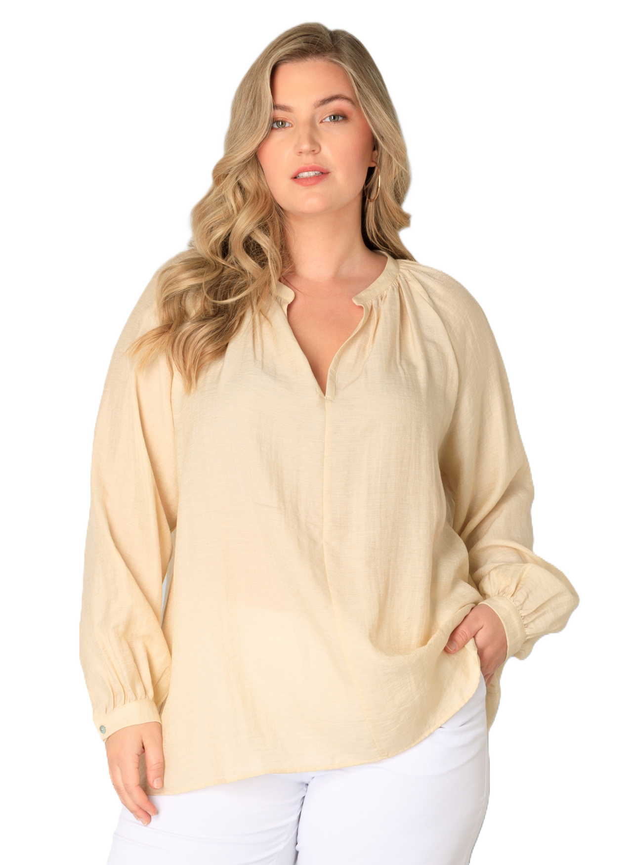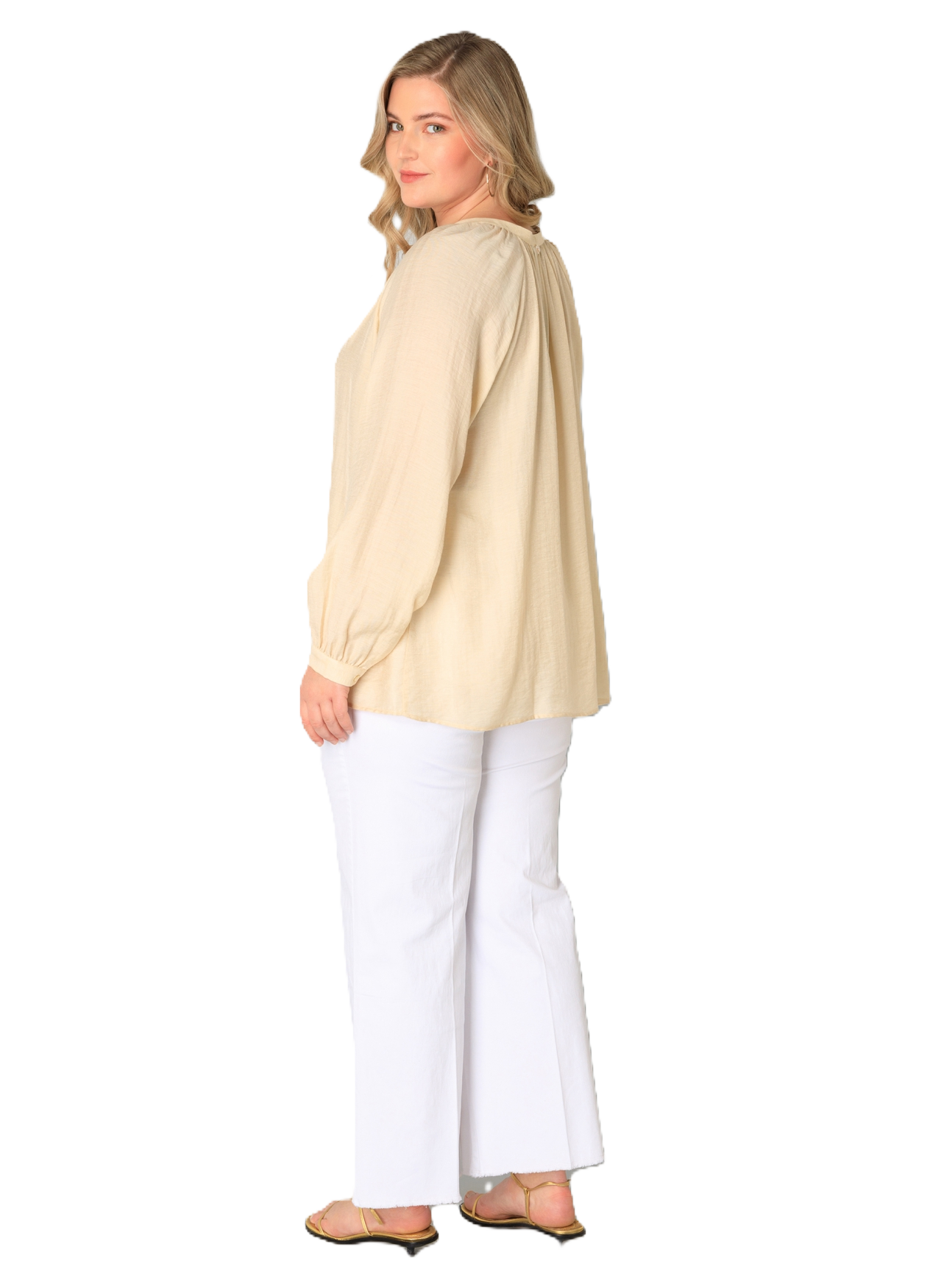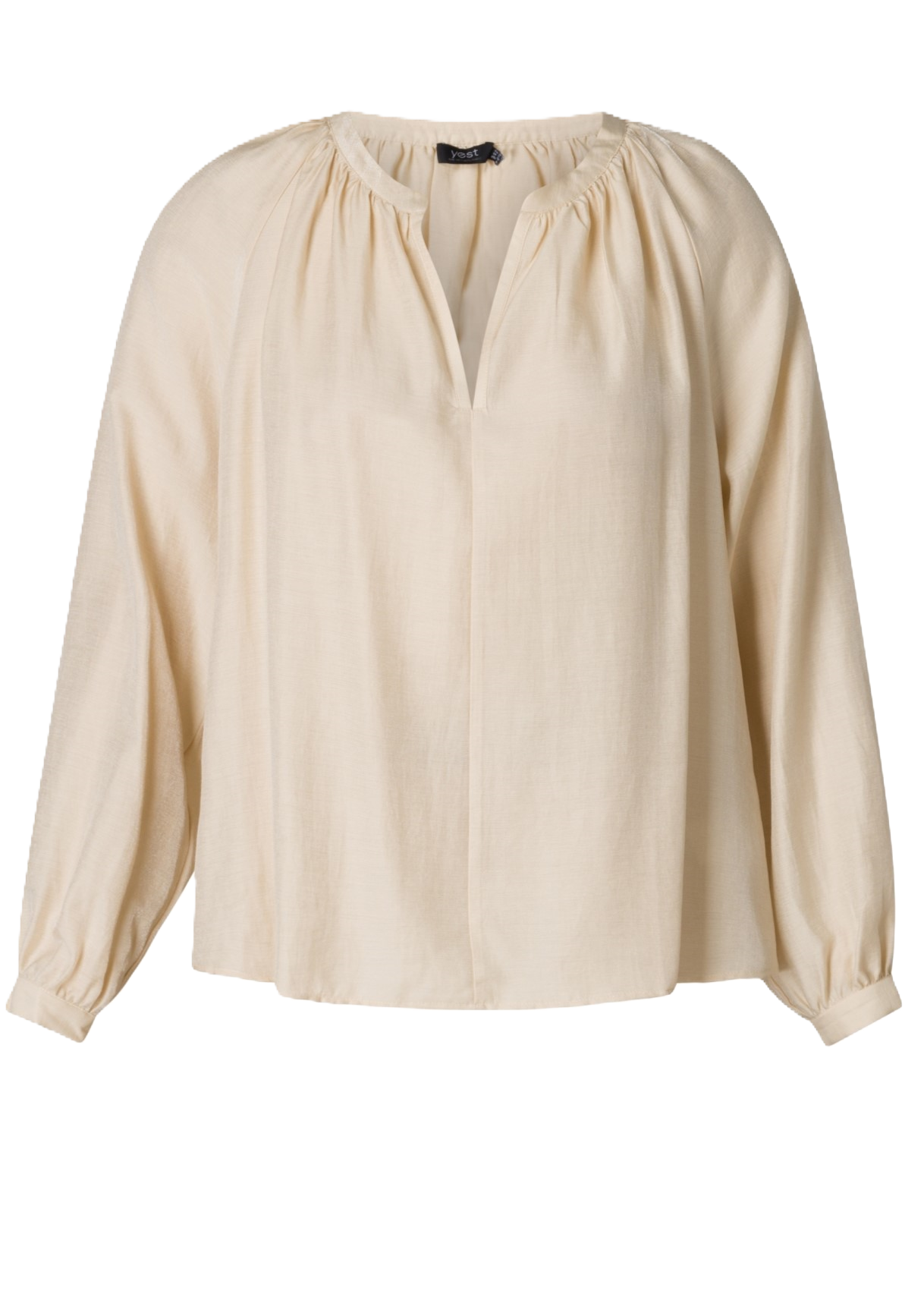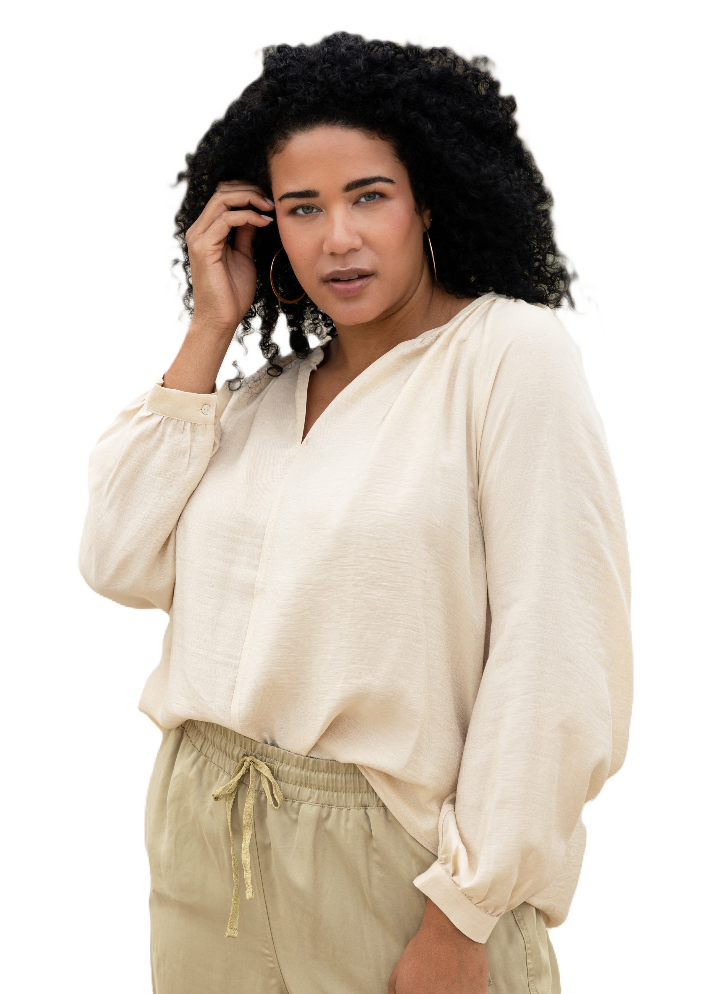Luchtig en elegant. Deze tuniekblouse in zachte viscose satijn heeft een verfijnde uitstraling met zijn ronde halslijn en subtiele plooitjes. De V-inkeping voegt een speels detail toe, terwijl de raglanmouwen en het luchtige ontwerp zorgen voor ultiem draagcomfort. Verkrijgbaar in 3 kleuren; Naturel White, Black en Bleached Sand.