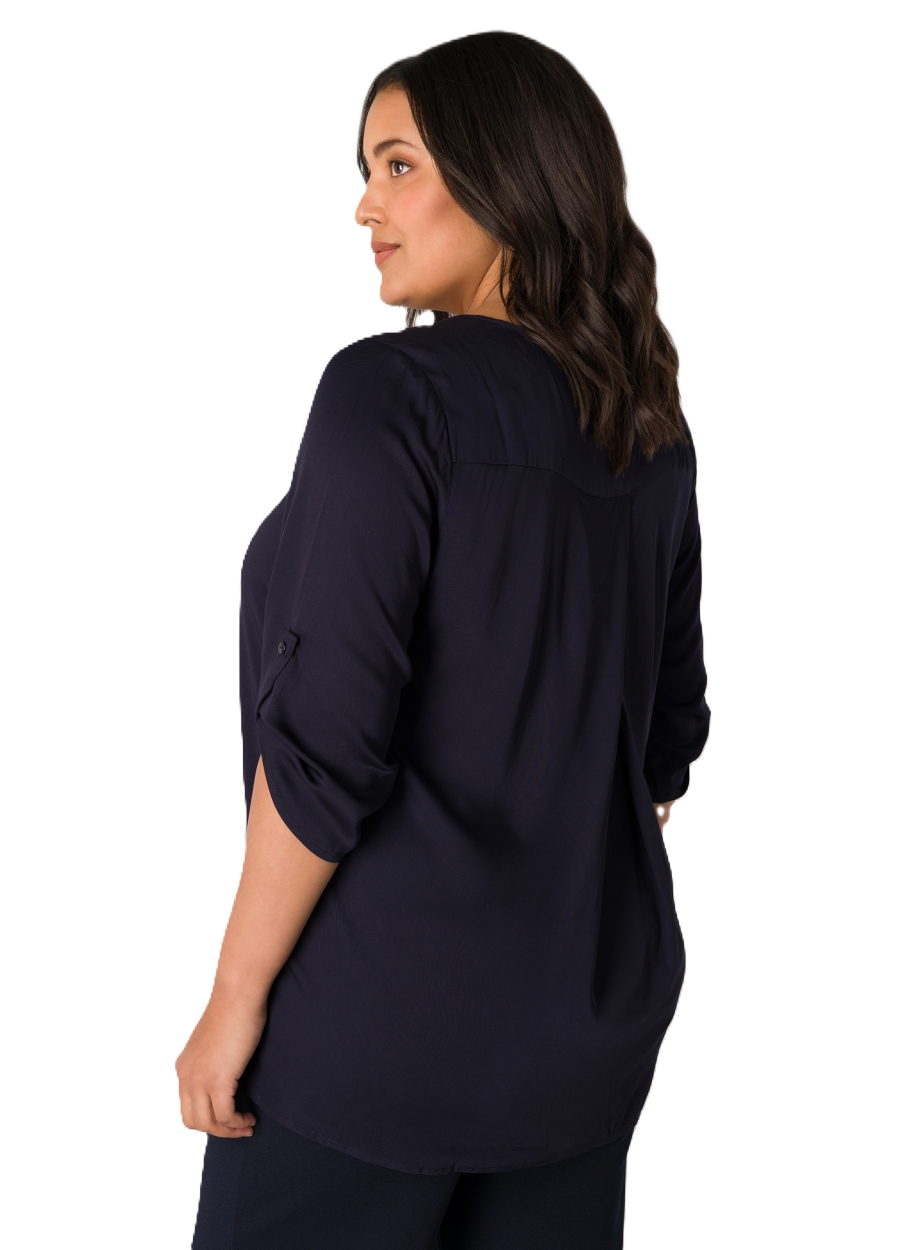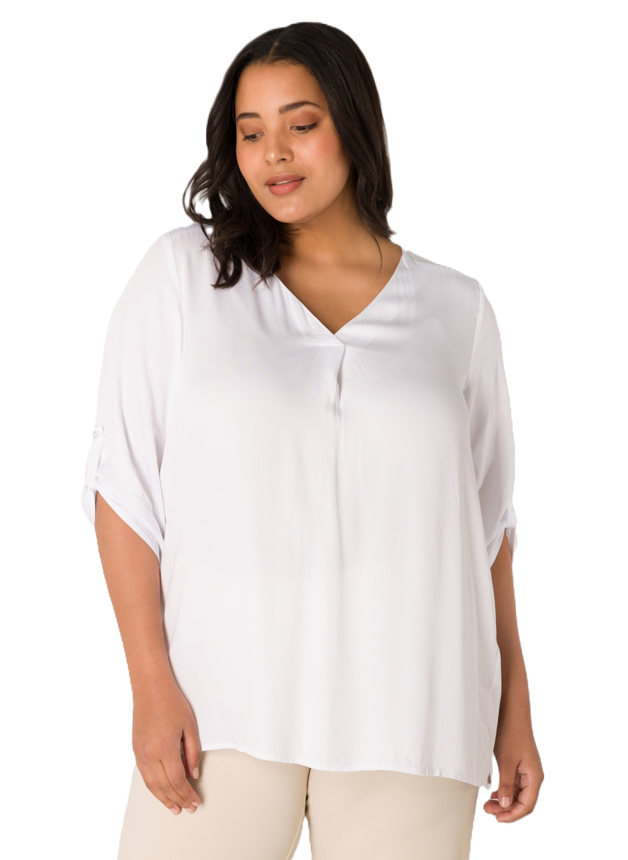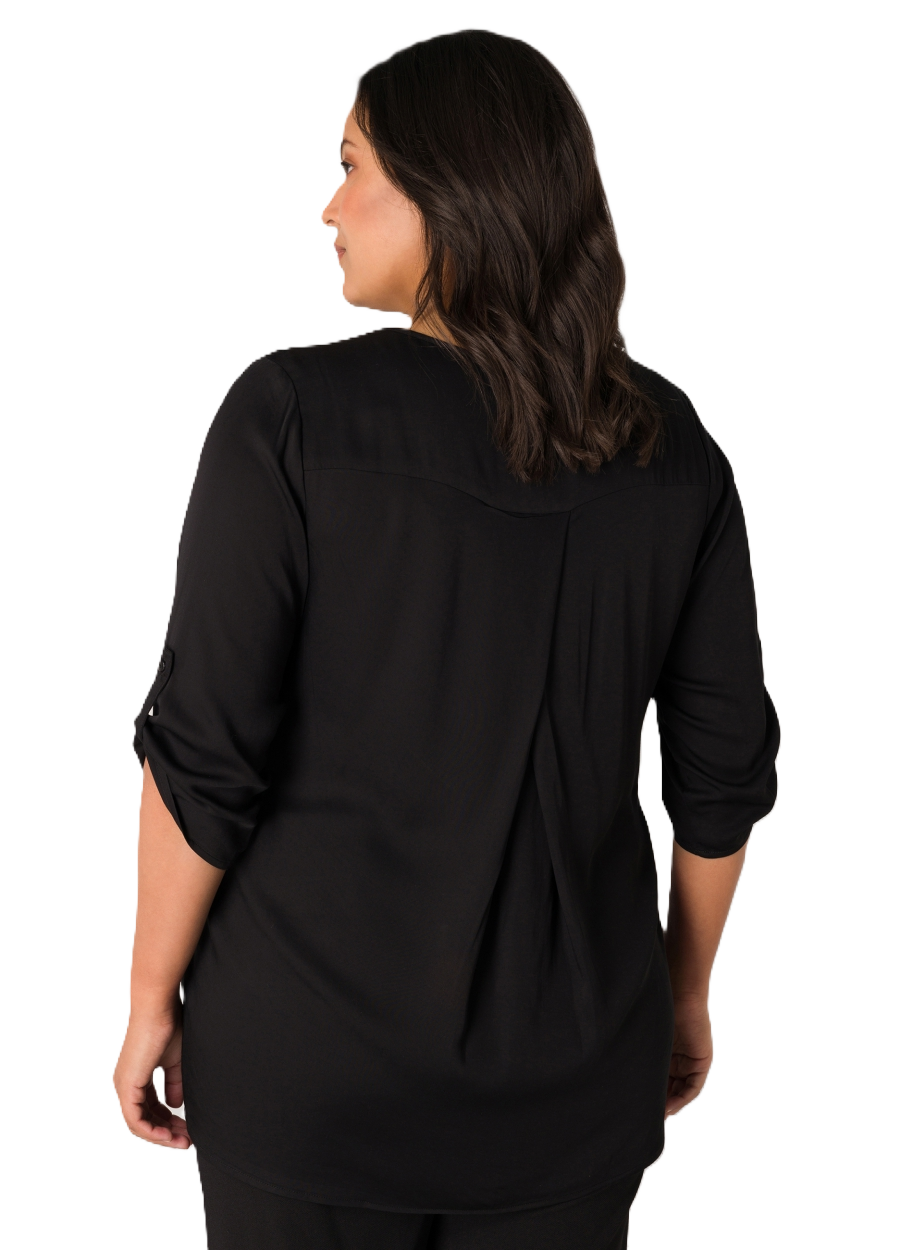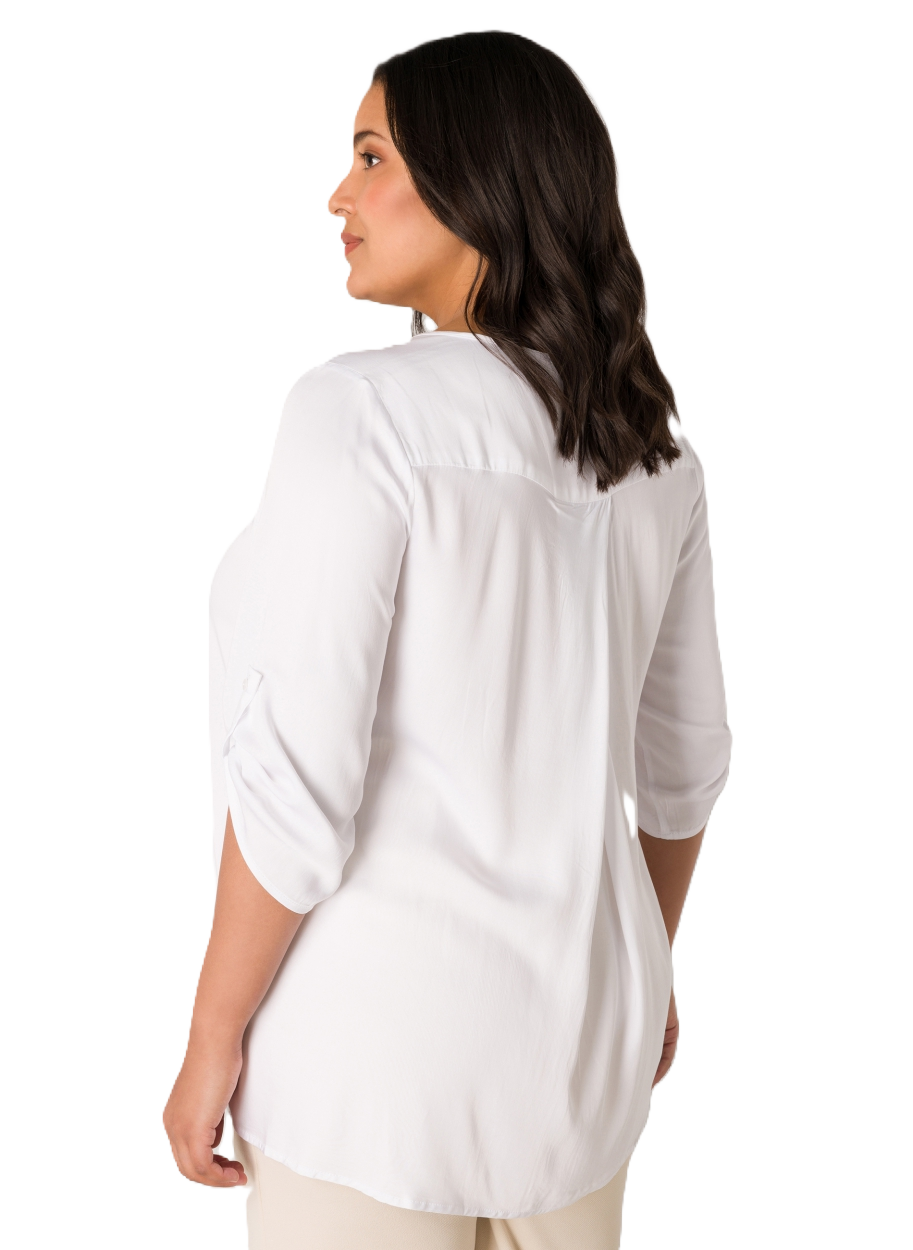 Blouse Yanina is gemaakt van een zachte Lenzing Ecovero, een materiaal gemaakt van houtpulp uit gecertificeerde bronnen. Deze vezels hebben een EU-milieukeurmerk gekregen voor materiaal, productie en distributie. De blouse heeft een driekwart mouw die kan worden opgerold en vastgezet door een knoopsluiting en is verkrijgbaar in de kleuren white, dark blue en black.