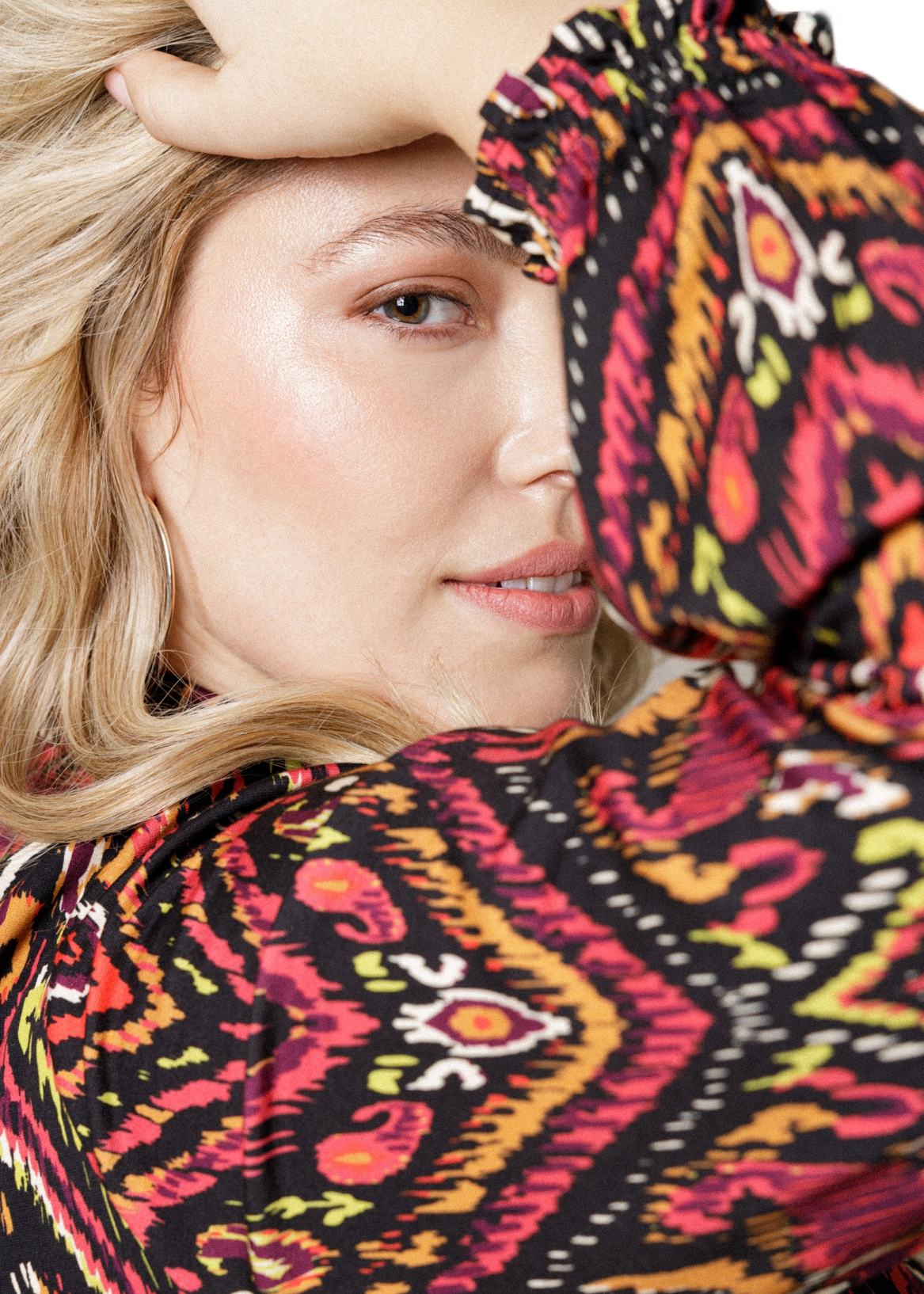 Deze blousejurk combineert draagcomfort met veelzijdigheid. De soepele stof en losse fit geven bewegingsvrijheid, terwijl de rode print je outfit direct opfleurt. De mouwen met elastische manchetten maken hem luchtig en vrouwelijk. Mooi als jurk, maar ook open als lange blouse te stylen. Lengte 110 cm.