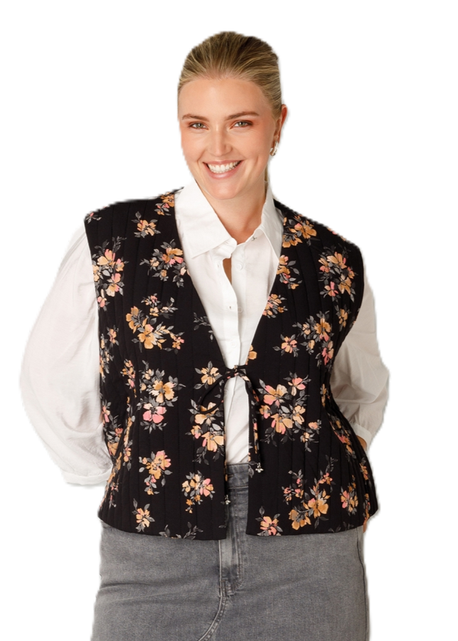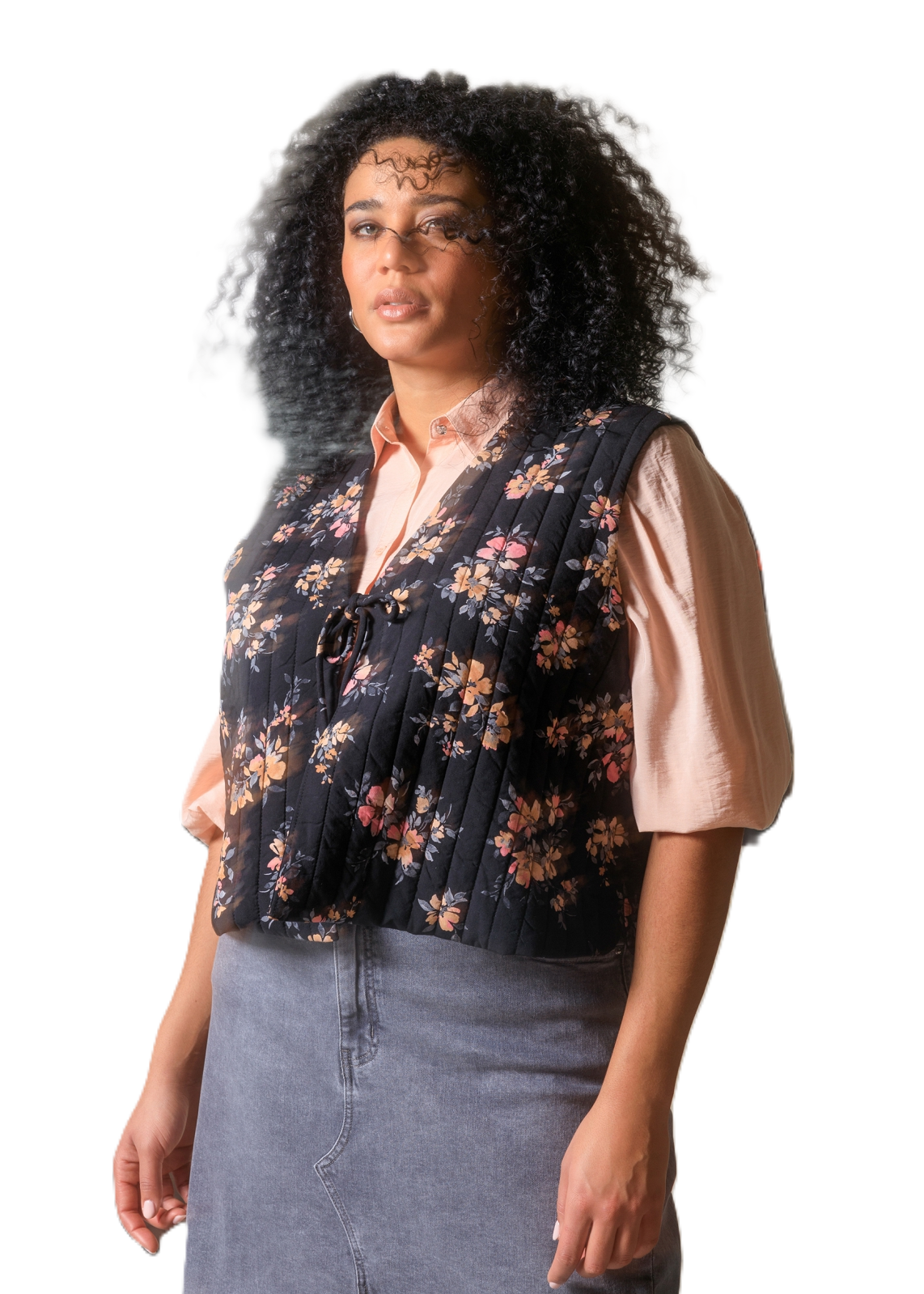 Met dit giletje voeg je wat warmte en stijl toe zonder dat het te zwaar wordt. De zwart/roze bloemenprint geeft ?m een vrouwelijke touch, en de sluiting met twee strikjes maakt het helemaal af.