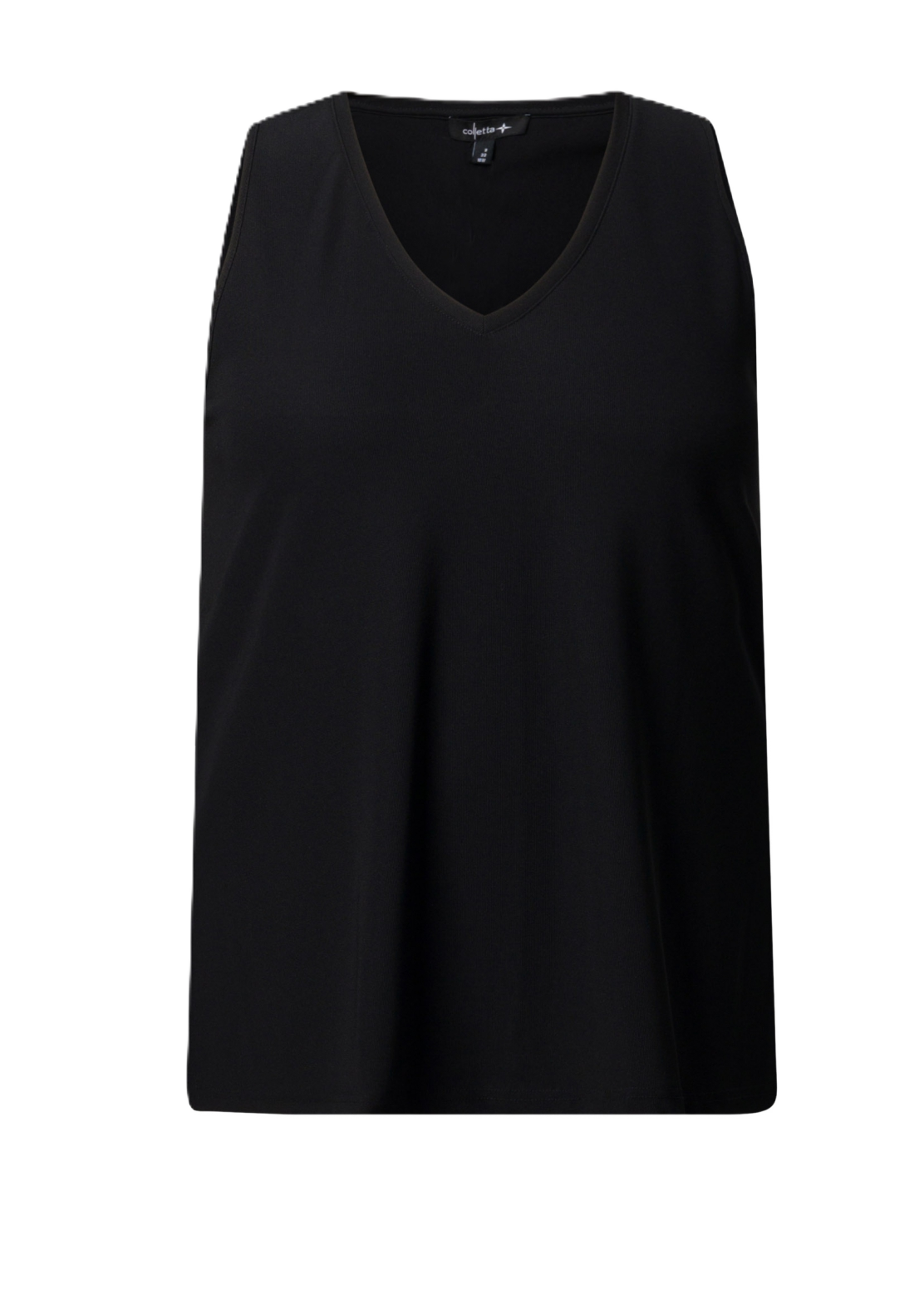Deze zwarte top is ideaal om eindeloos te combineren. De soepele stof voelt zacht op de huid en blijft mooi in vorm. De V-hals en mouwloze A-lijn snit geven een luchtig effect. Perfect onder een blazer, vest. Lengte 74 cm.