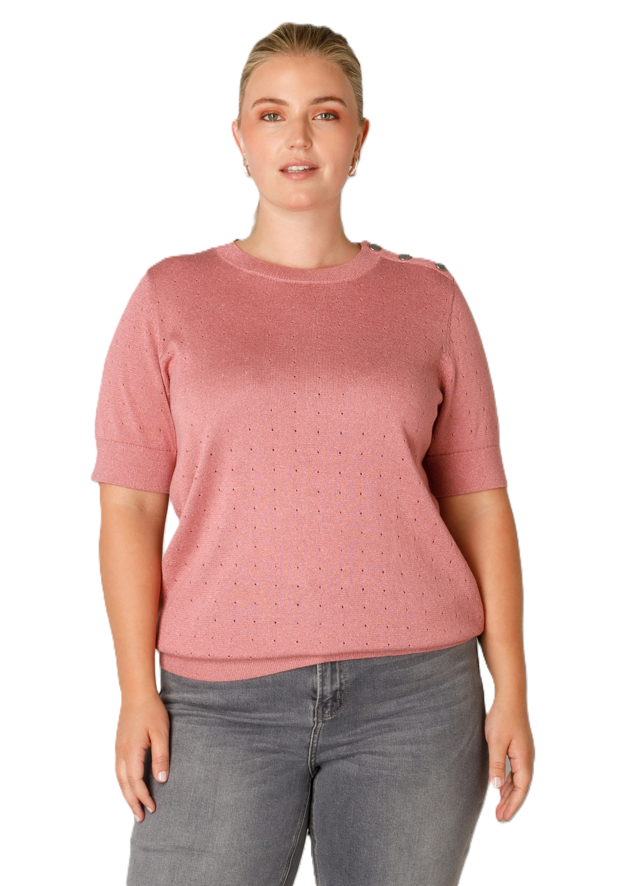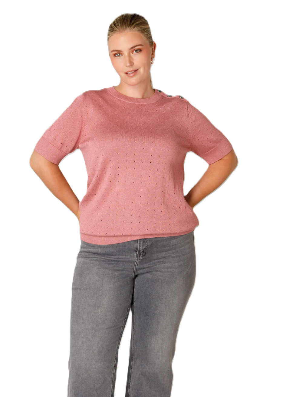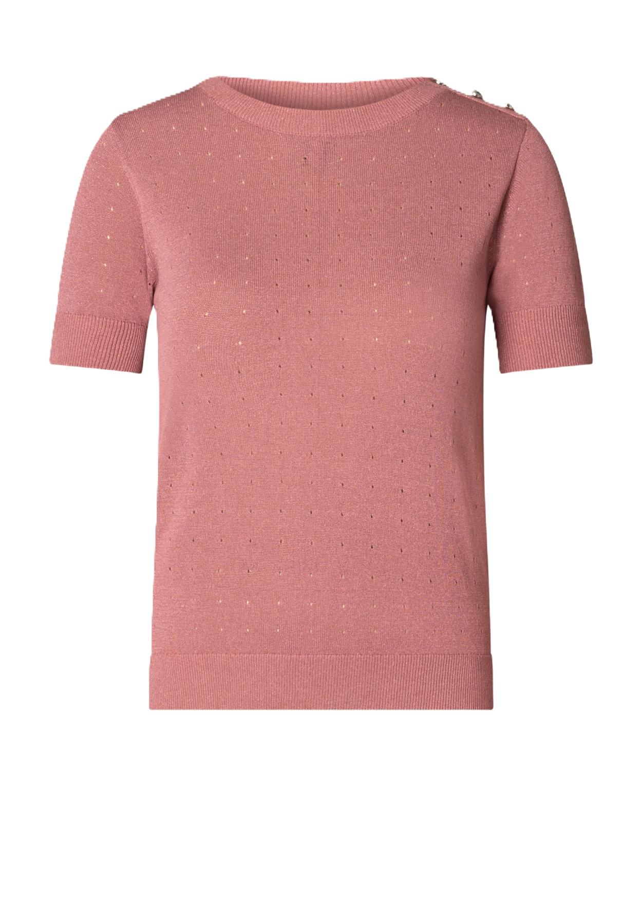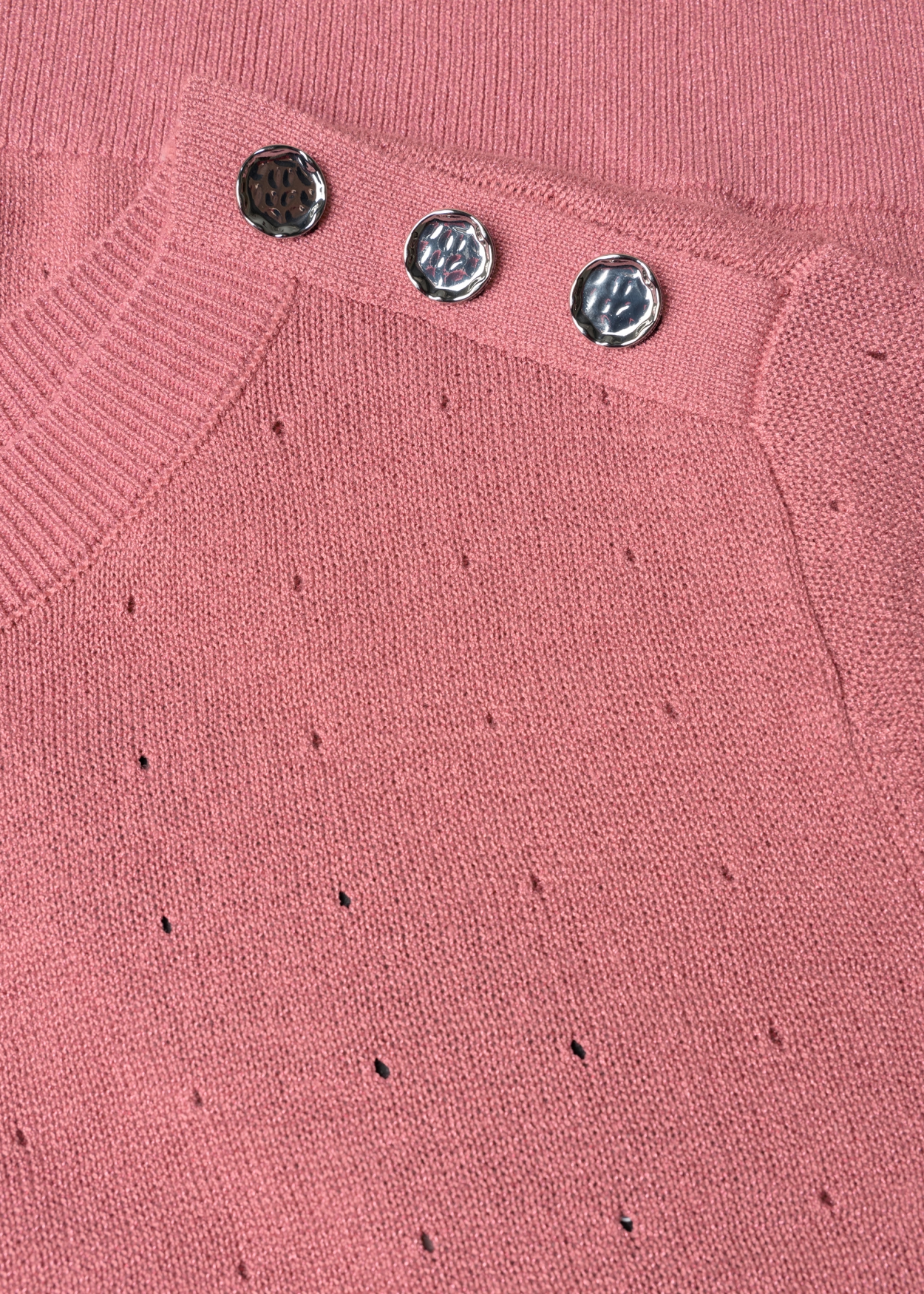Dit topje valt op door de fijne, opengewerkte structuur en het lichte breisel. Gemaakt van viscose, metallized fibre en nylon, voelt het zacht en licht aan. De schouderknopen voegen een subtiel maar stijlvol accent toe aan dit comfortabele item.