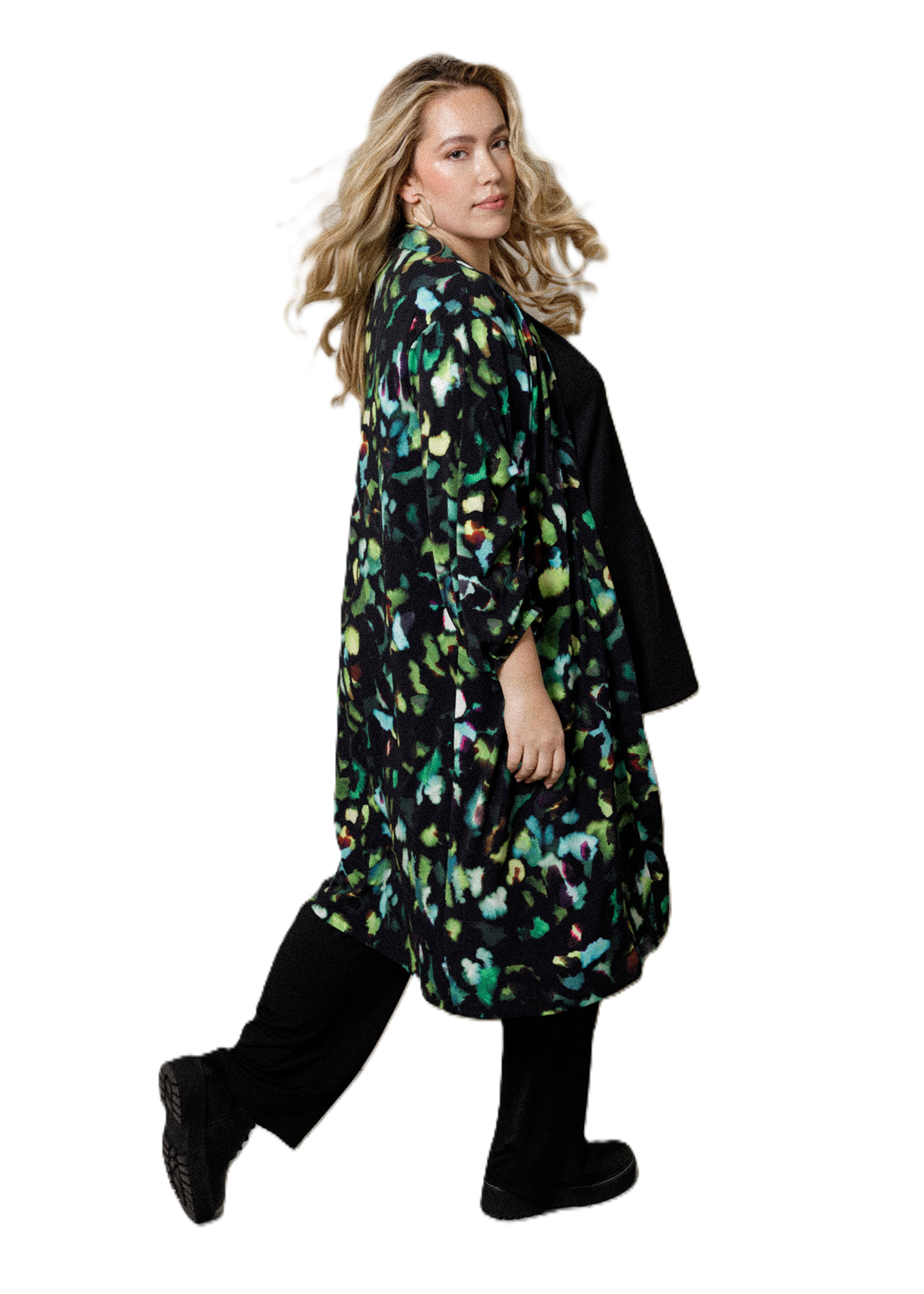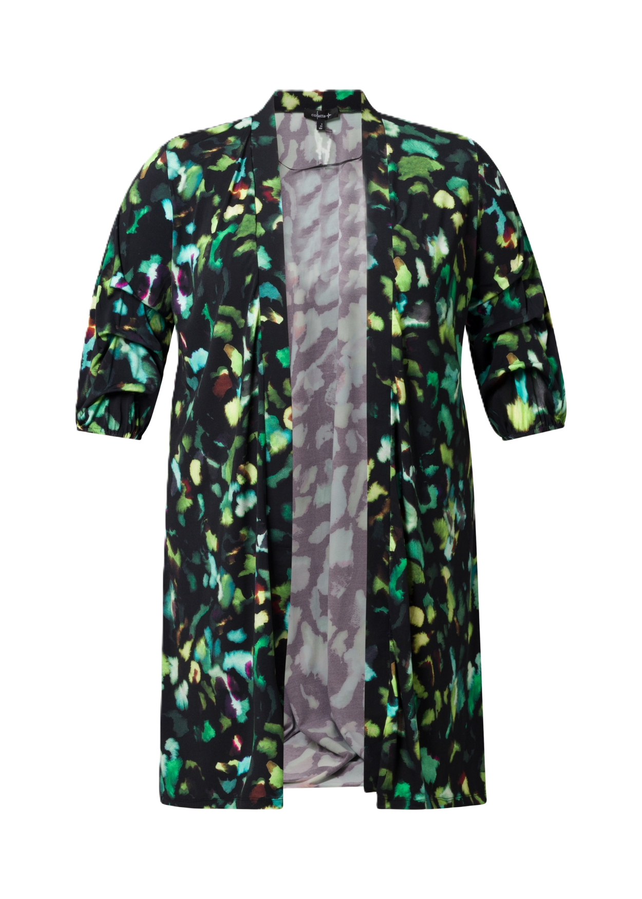 Dit openvallende vest is gemaakt van een zachte jersey (95% polyester, 5% elastane) die soepel meebeweegt en nauwelijks kreukt. De groene multiprint geeft direct pit aan je outfit, terwijl de 3/4-mouwen met subtiel plooi-effect zorgen voor een bijzonder detail. Perfect over een effen top of jurk.. Lengte 107 cm.