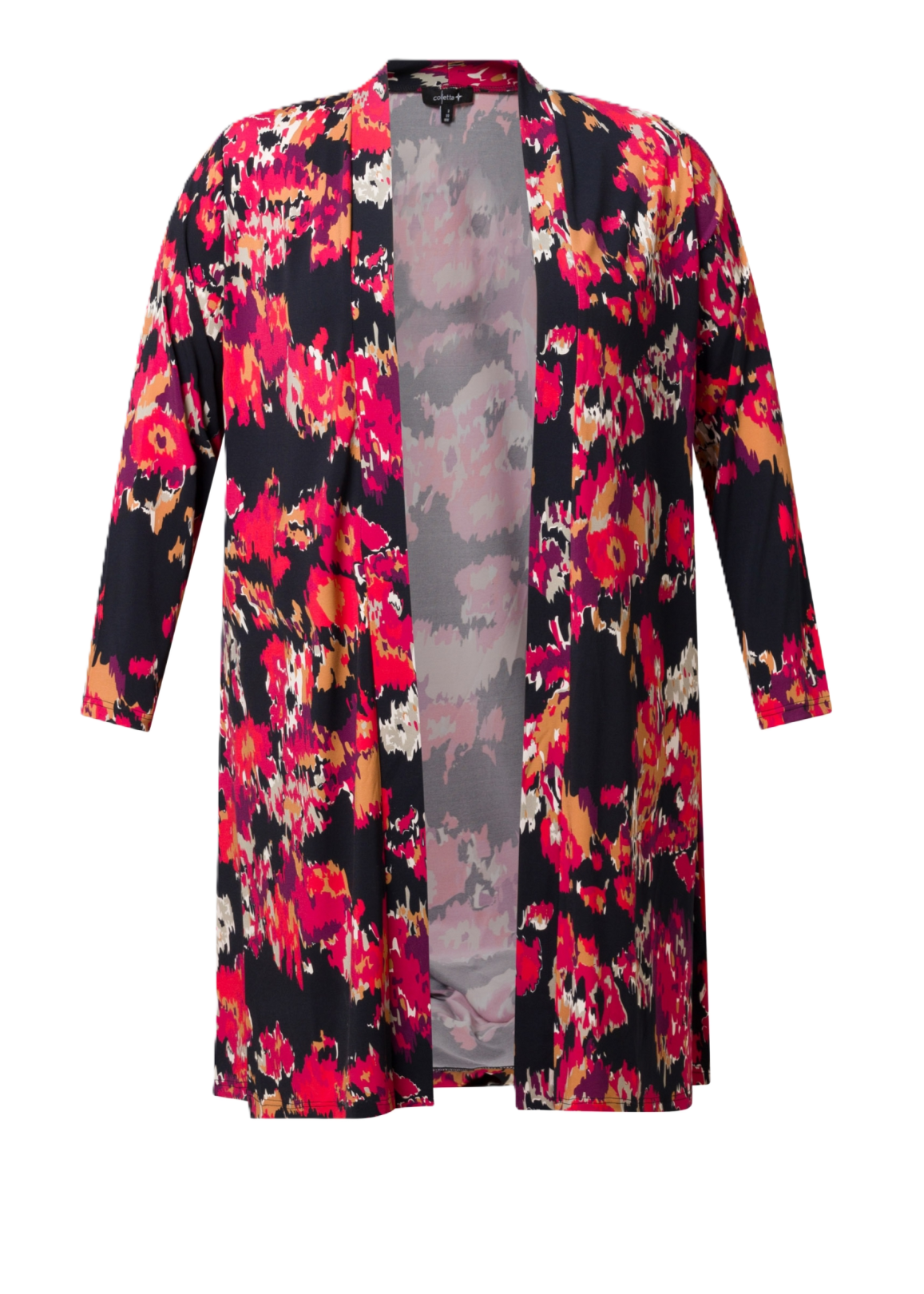 Een vest dat meteen sfeer toevoegt! De opvallende bloemenprint in rood, zwart en warme tinten maakt dit item bijzonder. Dankzij de soepele jersey stof draagt het licht en comfortabel, zonder snel te kreuken. Het openvallende, lange model laat zich prachtig combineren met tijdloos zwart. lengte 107 cm.