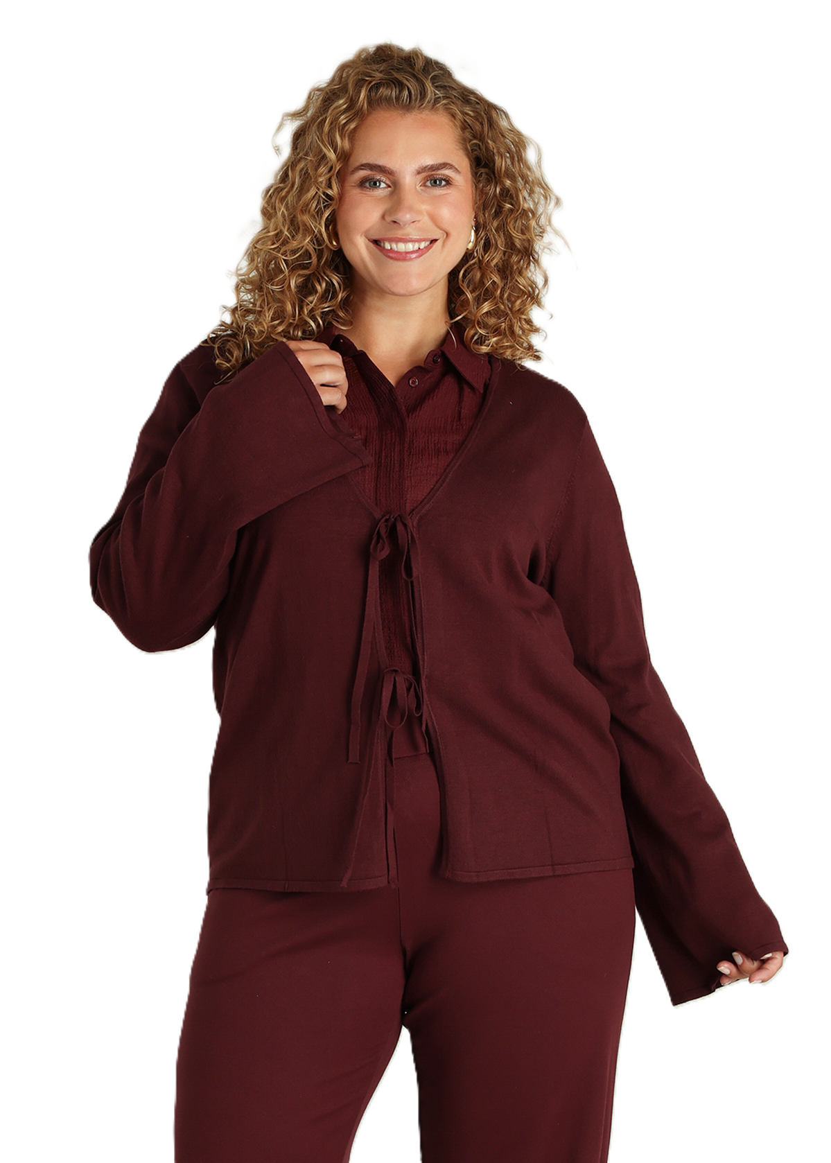 en knit met karakter: dit vestje heeft een recht model en sluit met fijne strikjes aan de voorkant. De portkleur geeft warmte aan je outfit, terwijl de licht uitlopende mouwen voor een relaxte look zorgen. Een veelzijdig item dat je moeiteloos op een jeans of rok draagt. Lengte 65 CM.